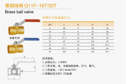 - 簡介: 黃銅球閥Q11F-16T/20T技術規范: 1.公稱壓力:1.6MPa 2.工作介質:水、非腐蝕性液體、空氣、煤氣。 3.工作溫度:-20C≤t≤150℃ 4.管螺紋符合ISO228標準 …